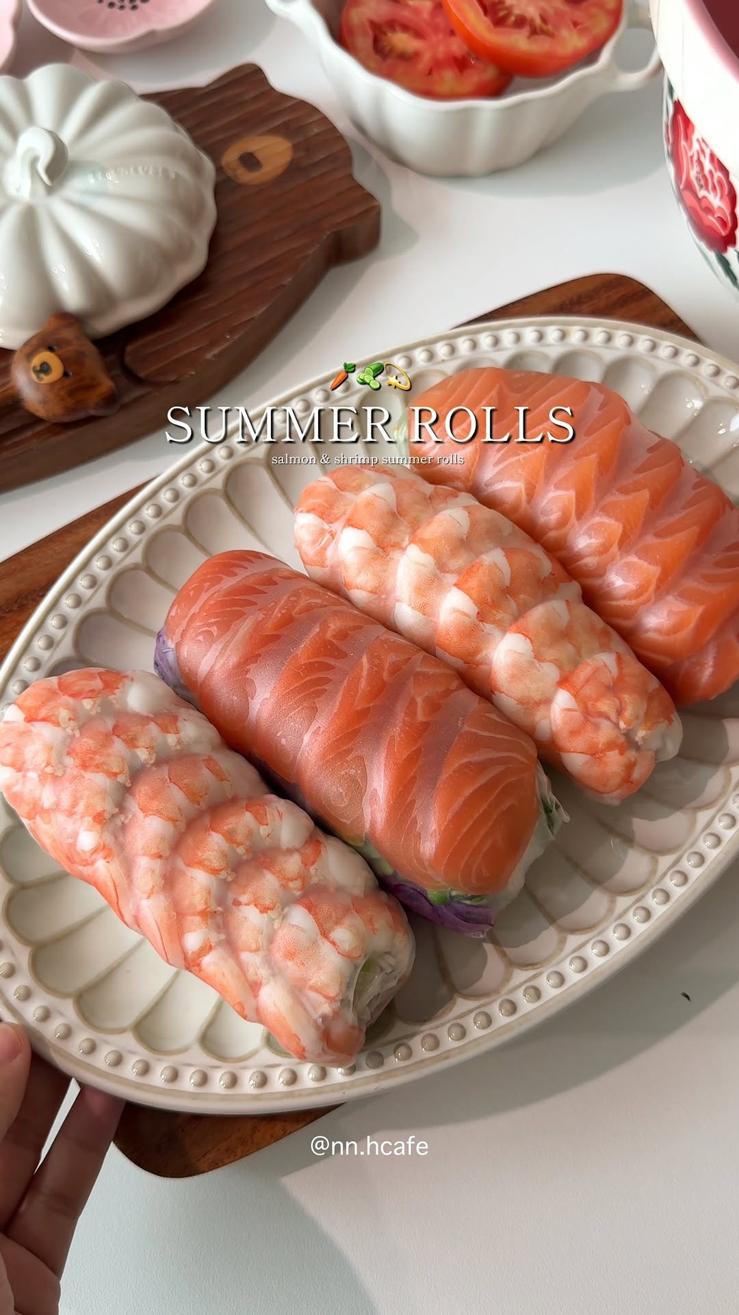 Fill the spring roll wrappers with shrimp, salmon, and vegetables.