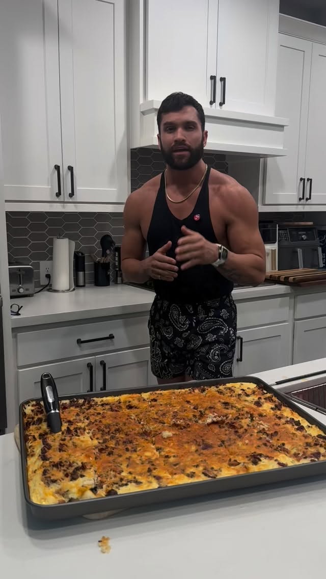 Assemble & Bake: Take a 1 inch deep pan and add 40 ounces hashbrowns low-calorie. Add your egg mix, add your beef and bacon mix, and add one bag of fat-free cheese over the top.