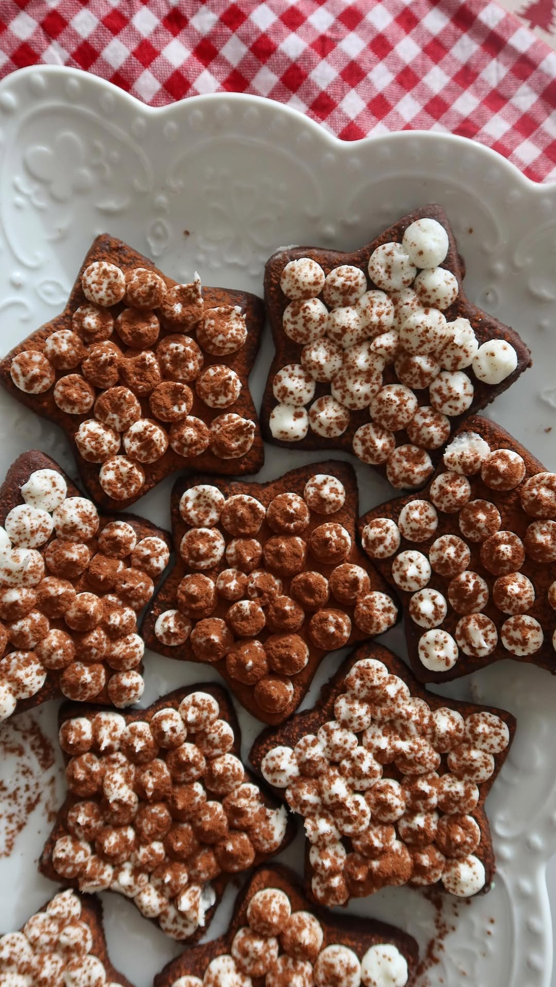 Once the cookies have cooled completely, decorate them with the buttercream icing and dust with cocoa powder.