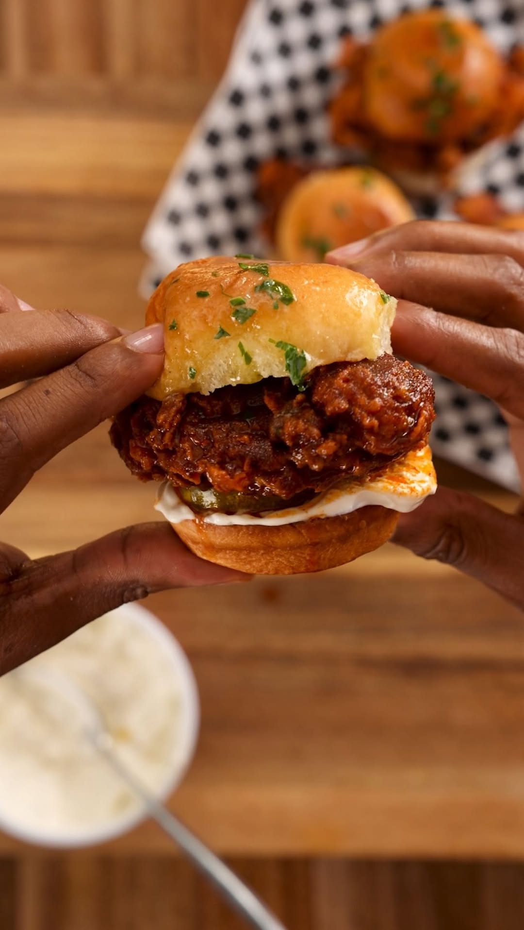 Toast slider buns with garlic butter, stack with pickles, spicy crispy chicken, and French onion dip.