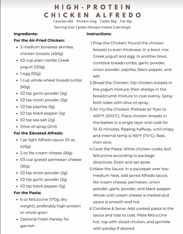 A healthier version of Chicken Alfredo with air-fried chicken and a creamy sauce.