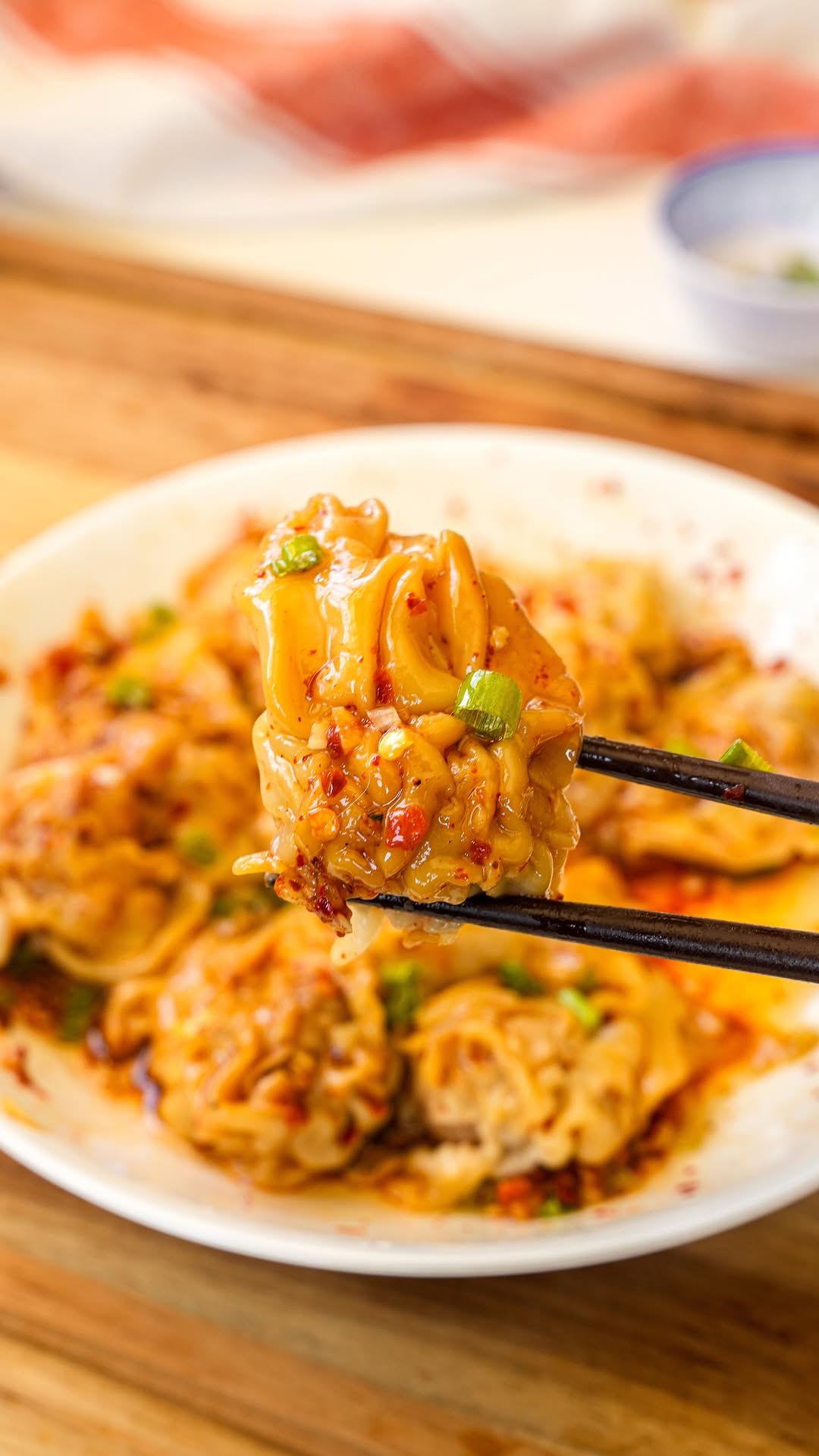 To cook the wontons, bring a large pot of water to a boil. Stir gently with a spatula or spoon, and cook until the wontons are floating to the top. Transfer the wontons to a bowl, add chili oil/sauce, serve hot and enjoy!
