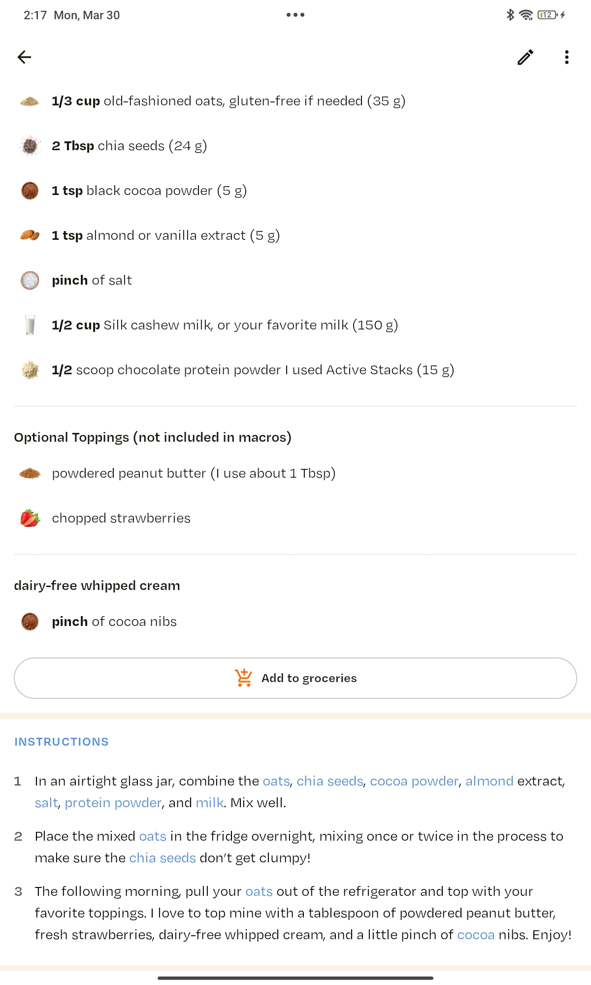 The following morning, top with powdered peanut butter, fresh strawberries, dairy-free whipped cream, and a pinch of cocoa nibs. Enjoy!