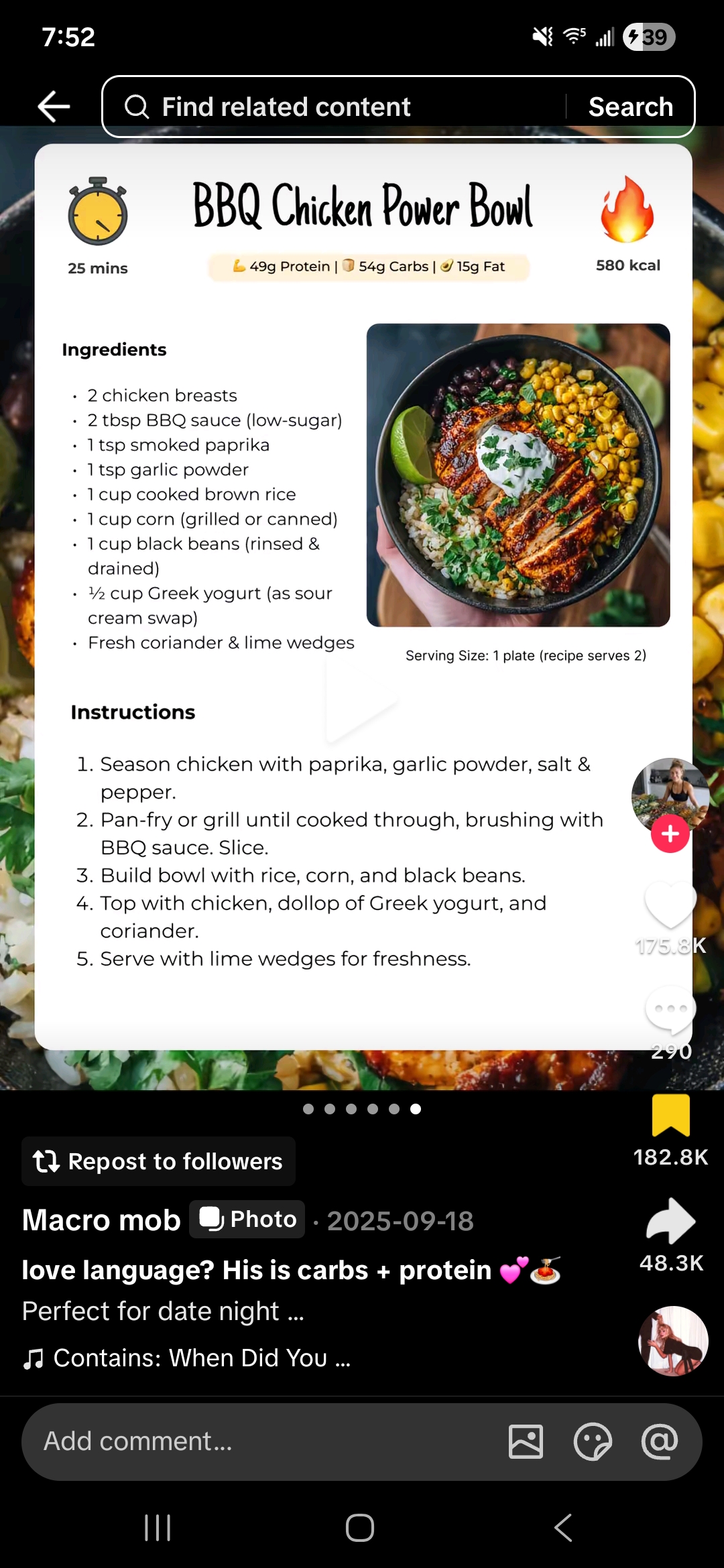 A nutritious and flavorful bowl with BBQ chicken, brown rice, corn, and black beans, topped with Greek yogurt and fresh coriander.